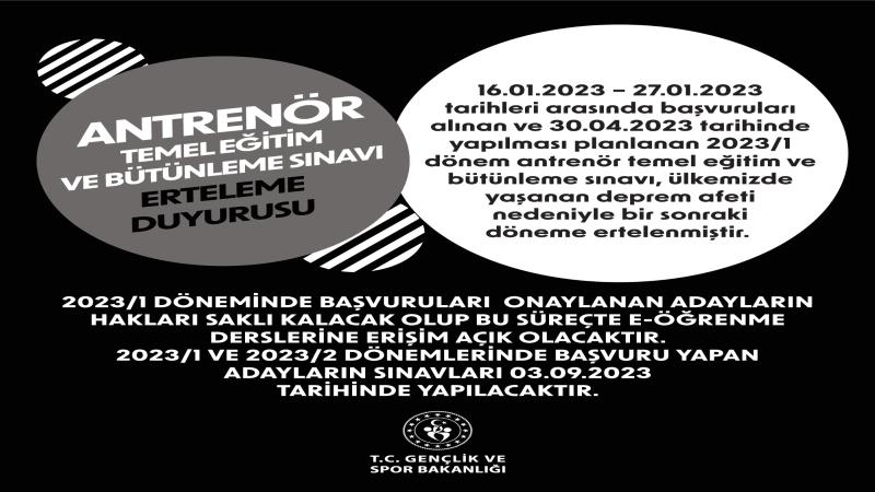16.01.2023 – 27.01.2023 tarihleri arasında başvuruları alınan ve 30.04.2023 tarihinde yapılacak olan 2023/1 dönem Antrenör Temel Eğitim ve Bütünleme Sınavı, ülkemizde yaşanan deprem afeti nedeniyle bir sonraki döneme ertelenmiştir.