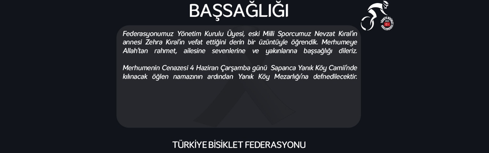 Federasyonumuz Yönetim Kurulu Üyesi, eski Milli Sporcumuz Nevzat Kıral’ın annesi Zehra Kıral’ın vefat ettiğini derin bir üzüntüyle öğrendik. Merhumeye Allah’tan rahmet, ailesine sevenlerine ve yakınlarına başsağlığı dileriz.