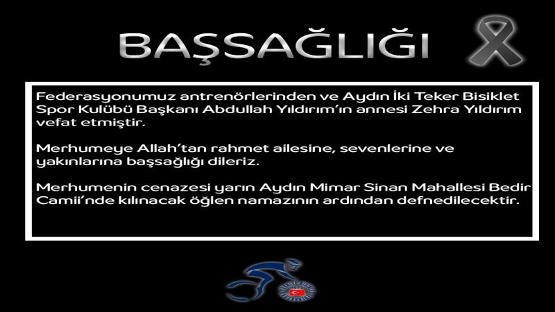 Federasyonumuz antrenörlerinden ve Aydın İki Teker Bisiklet Spor Kulübü Başkanı Abdullah Yıldırım’ın annesi Zehra Yıldırım vefat etmiştir.