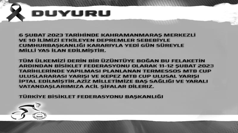 Tüm ülkemizi derin bir üzüntüye boğan bu felaketin ardından Bisiklet Federasyonu olarak 11-12 Şubat 2023 tarihlerinde yapılması planlanan Termessos MTB Cup Uluslararası yarışı ve Kepez MTB Cup Ulusal yarışı iptal edilmiştir.